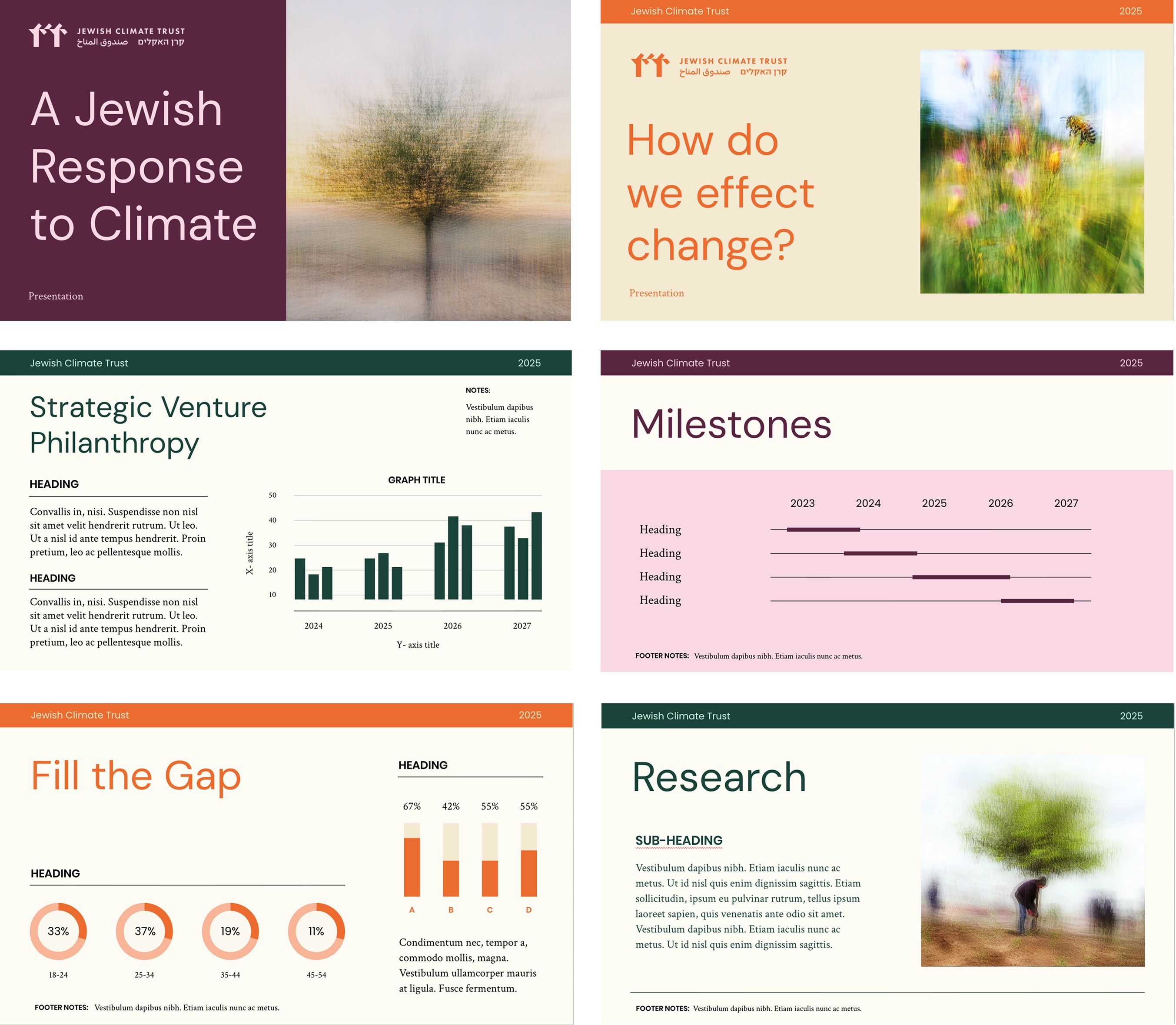 This identity doesn’t need to shout. It earns attention through restraint and confidence. Across reports, convenings and campaigns, the system builds consistency and credibility. It is flexible, dignified and designed to grow across every platform. The Jewish Climate Trust now stands as a serious and strategic force for climate action — a brand built not just to inspire belief but to mobilise it, underpinned by an identity that thinks, acts and gives us reason to hope.